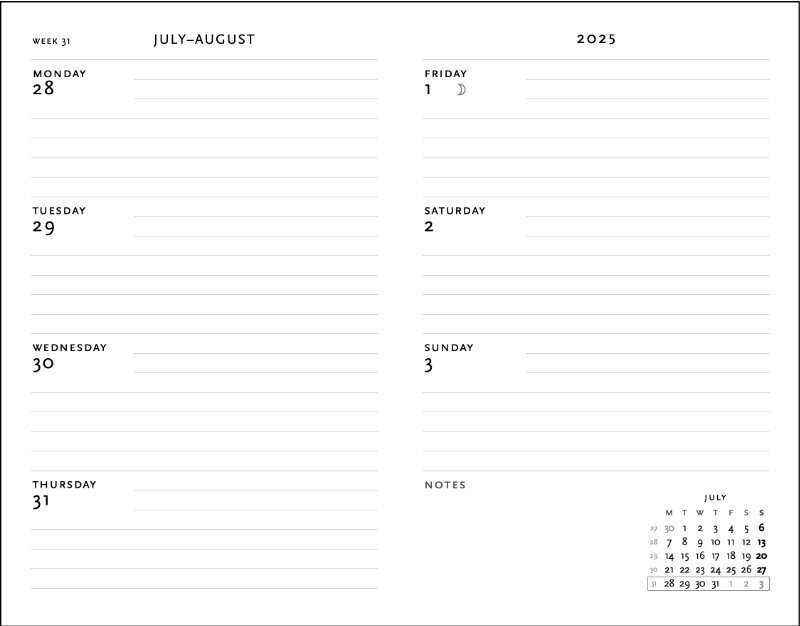 Η εβδομαδιαία ατζέντα Paperblanks 2026 θα σας βοηθήσει να οργανώσετε τις καθημερινές σας υποχρεώσεις με ευχάριστο τρόπο. Με ξεχωριστές εγγραφές για κάθε ημέρα της εβδομάδας, μπορείτε να κρατάτε σημειώσεις για ραντεβού, γενέθλια και προθεσμίες, εξασφαλίζοντας έτσι ότι δεν θα χάσετε τίποτα σημαντικό.