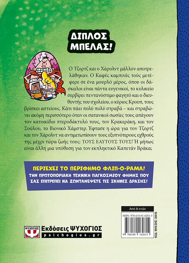 Ο Τζορτζ και ο Χάρολντ μάλλον αποτρελάθηκαν. Ο Καφές καμπινές τούς μετέφερε σε ένα μουρλό μέρος, όπου οι δάσκαλοι είναι πάντα ευγενικοί, το κυλικείο σερβίρει πεντανόστιμο φαγητό και ο διευθυντής του σχολείου, ο κύριος Κρουπ, τους βρίσκει αστείους. Κάτι πάει πολύ πολύ στραβά – και στραβώνει ακόμη περισσότερο όταν οι σατανικοί σωσίες τους απάγουν τον κατοικίδιο πτεροδάκτυλό τους, τον Κρακεράκη, και τον Σούλου, το Βιονικό Χάμστερ. Έφτασε η ώρα για τον Τζορτζ και τον Χάρολντ να αντιμετωπίσουν τους εξυπνότερους εχθρούς της μέχρι τώρα ζωής τους: ΤΟΥΣ ΕΑΥΤΟΥΣ ΤΟΥΣ! Ή μήπως είναι άλλη μια υπόθεση για τον εκπληκτικό Καπετάν Βράκα;