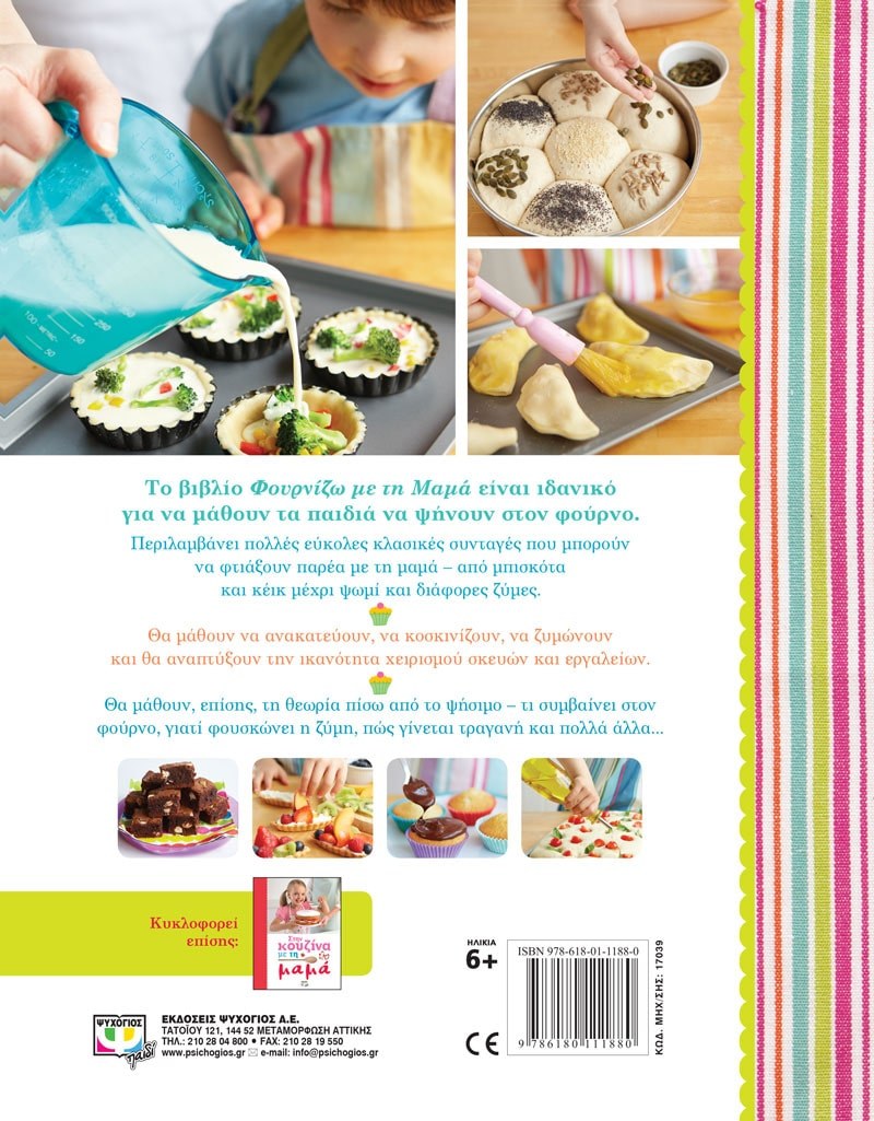 Το βιβλίο Φουρνίζω µε τη Μαµά είναι ιδανικό για να µάθουν τα παιδιά να ψήνουν στον φούρνο. Περιλαµβάνει πολλές εύκολες κλασικές συνταγές που µπορούν να φτιάξουν παρέα µε τη µαµά – από μπισκότα και κέικ µέχρι ψωµί και διάφορες ζύµες. Θα µάθουν να ανακατεύουν, να κοσκινίζουν, να ζυµώνουν και θα αναπτύξουν την ικανότητα χειρισµού σκευών και εργαλείων. Θα µάθουν, επίσης, τη θεωρία πίσω από το ψήσιµο – τι συµβαίνει στον φούρνο, γιατί φουσκώνει η ζύµη, πώς γίνεται τραγανή και πολλά άλλα…